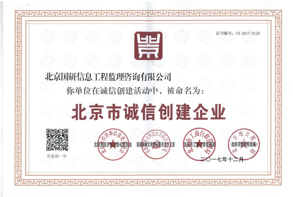 北京國研信息工程監(jiān)理咨詢有限公司獲“2017年北京市誠信創(chuàng)建企業(yè)”榮譽(yù)稱號(hào)
