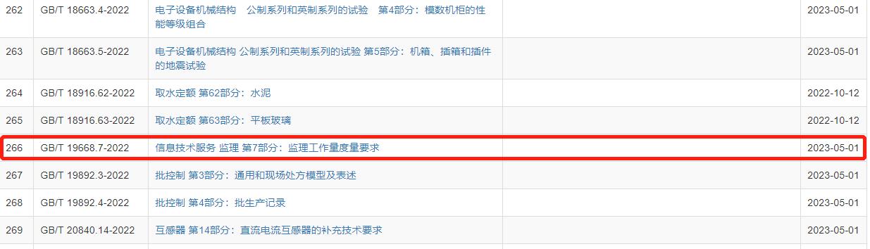 2022年10月14日,國(guó)家市場(chǎng)監(jiān)督管理總局(國(guó)家標(biāo)準(zhǔn)化管理委員會(huì))發(fā)布“中華人民共和國(guó)國(guó)家標(biāo)準(zhǔn)公告”(2022年第13號(hào)),正式發(fā)布《信息技術(shù)服務(wù) 監(jiān)理 第7部分:監(jiān)理工作量度量要求》。